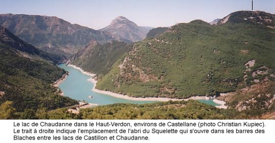 En prospection dans le Haut Verdon Persuadé qu’il existait des cavités à découvrir dans les environs de Castellane, j’ai entamé une prospection de la montagne des Blaches en partant du col du Cheiron (alt. 887 m) et suis remonté vers le sommet (1309 m) situé entre les lacs de Castillon et Chaudanne dans le Haut Verdon. Là , j’ai eu la chance de découvrir quelques fissures dans le rocher, pour la plupart infestées par la grande sauterelle des cavernes. Certaines de ces fissures sont suffisament larges pour mériter le nom de grottes, bien que leur formation n’ait rien de karstique. L’endroit n’est guère fréquenté, car la montagne assez déserte est reprise par la forêt qui gagne du terrain. La découverte de l’homme de Castellane Le 4 septembre 1994,