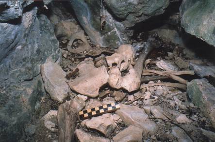 orifice supérieur qui m’a conduit à cette anfractuosité. A 5 m du pied de la falaise, l’entrée étroite d’une fissure présentant une chicane rocheuse livre accès à une minuscule chambre d’à peine 3 m² et d’environ 1,50 m de haut. Sur le sol gisent des ossements humains (bassin, fémurs, vertèbres, côtes) blanchis par le temps. A la vue des ossements, j’ai d’abord cru à un squelette préhistorique. La deuxième visite devait confirmer qu’il s’agissait d’un squelette relativement récent dont le crâne, coincé entre le bloc et la paroi, laissait apparaître les dents usées du maxillaire supérieur. La désobstruction